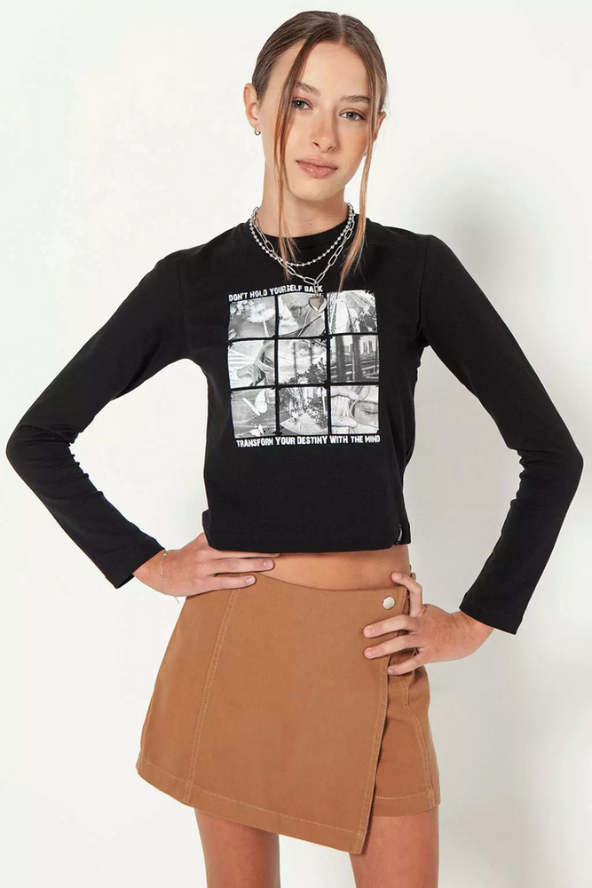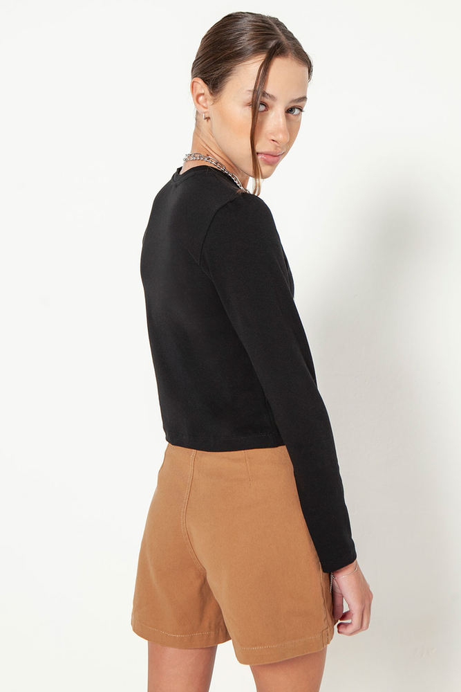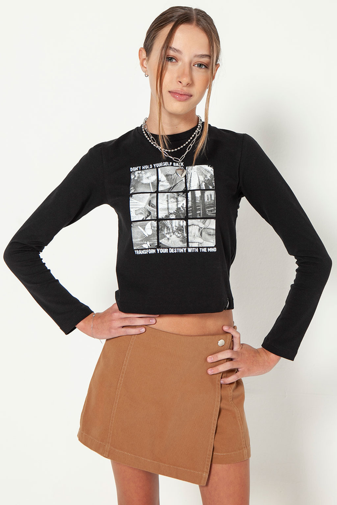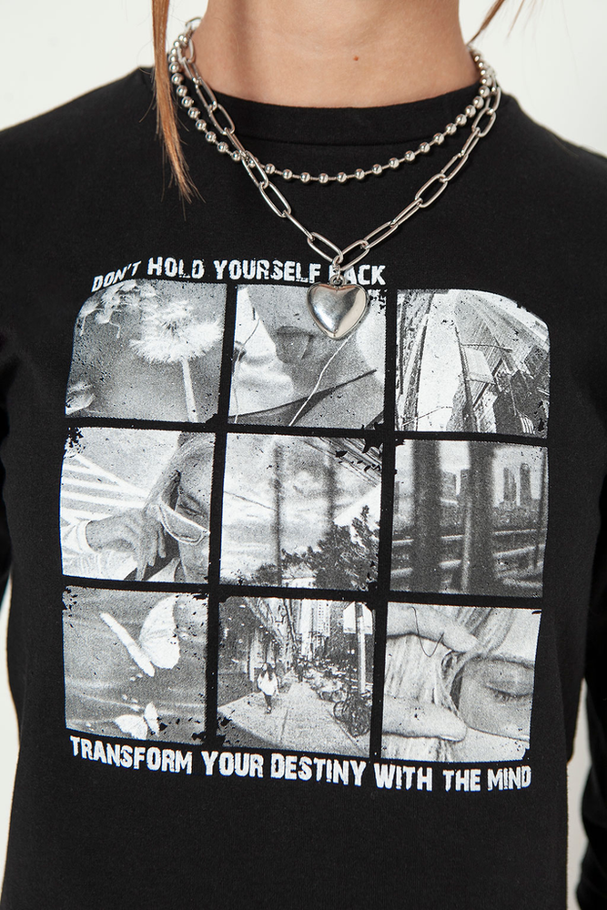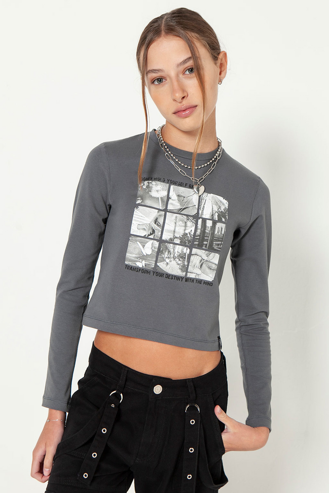 Remera algodón elastano, estampa "Don't Hold", silueta entallada, largo a la primera caderta, manga larga